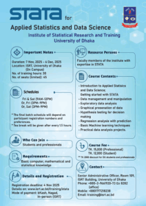 Follow the website for details: https://isrt.ac.bd/training/stata/